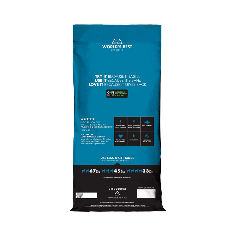 With its advanced clumping technology, World’s Best Cat Litter Multiple Blossom Formula forms tight, solid clumps upon contact with moisture, making cleanup effortless even in households with multiple cats. Bid farewell to unwanted odors as this litter locks away smells, leaving your home infused with the refreshing scent of blossoms.